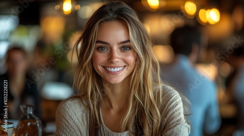 A young woman with long blonde hair smiles at the camera in a cafe setting.