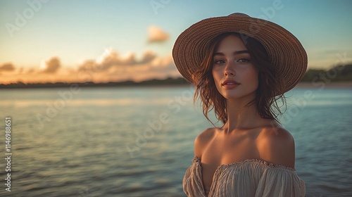 A young woman with long brown hair and a tan straw hat poses on the beach at sunset.