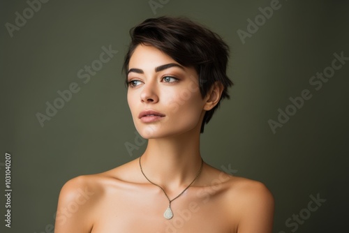 A young woman with short hair gazes thoughtfully to the side, set against a muted olive background, her expression serene and contemplative.