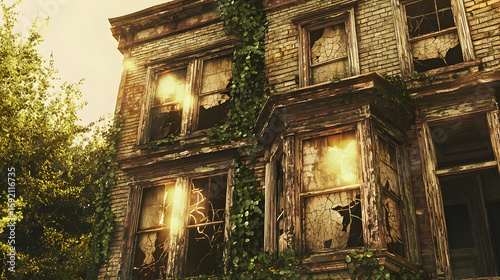 Abandoned house with broken windows, overgrown with vines, bathed in golden sunlight. Sunlight beams through broken glass, highlighting the decay
