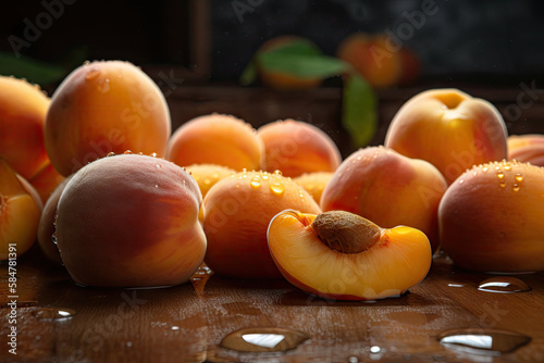 Abricots mûrs posés sur une table, environnement humide, gouttelettes d'eau sur les fruits, fond sombre