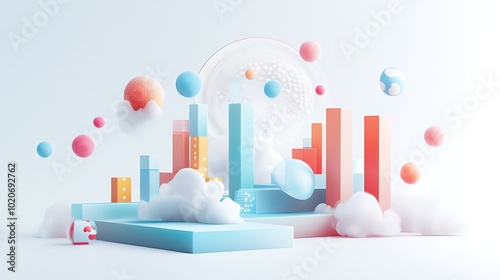 Abstract 3D Composition with Colorful Geometric Shapes, Clouds, and Spheres