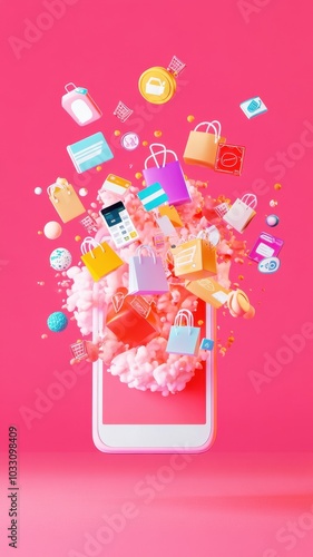 Abstract 3D model of a smartphone with exploding icons of shopping, discounts and digital payment solutions, pastel theme