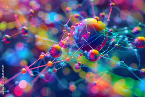 Abstract 3D Rendering of Colorful Spheres Connected by Thin Wires, Creating a Dynamic and Complex Network