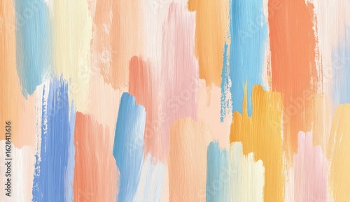 Abstract art with soft, pastel brushstrokes. A variety of light peach, beige, pastel blue, and orange colors create a visual tapestry