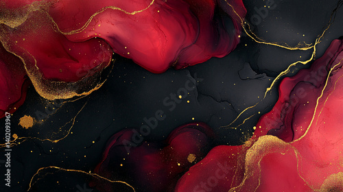 Abstract background featuring red and black swirls with golden accents and scattered gold specks
