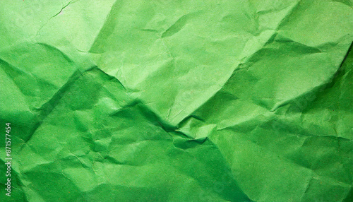 abstract background of green crumpled recycled office craft paper sheet, wallpaper presentation banner texture with space for copy, waste recycling, luxury minimalism