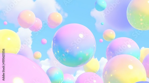 Abstract background: Pastel-colored floating bubbles against a bright blue sky