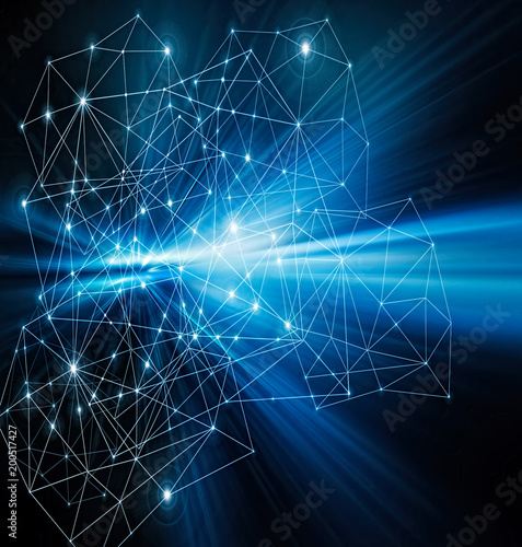 Abstract background with connected lines and dots for your design. Smooth lines, beautifully intertwined, shining dots and flashes on a dark background