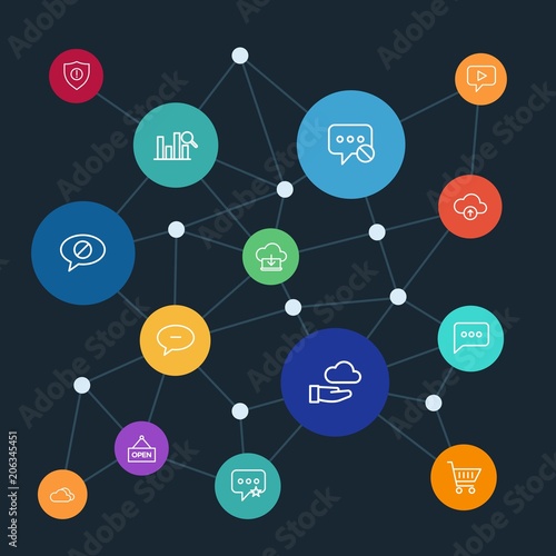 Abstract background with polygonal connected lines. Set of networking, charts, chat and messenger, security, shopping outline icons. Can be use for websites, mobile apps, presentations.