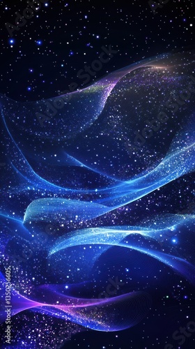 Abstract background with swirling blue and purple waves, stars twinkling in the sky, digital art, space theme, fantasy elements, cosmic glow, starry night atmosphere, cosmic ambiance