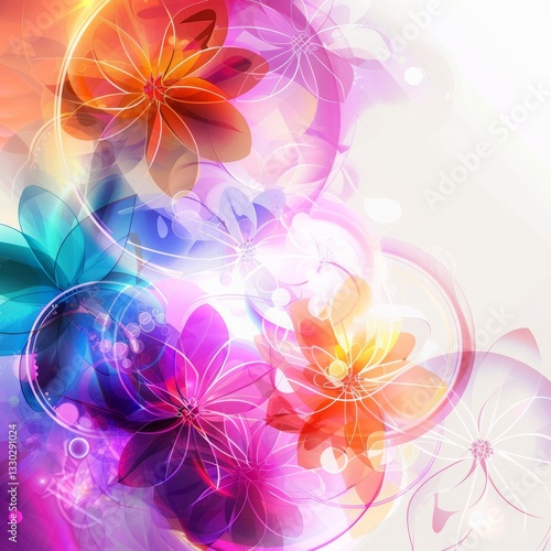 abstract background with translucent colored overlapping neon circle shapes and flowers on light background
