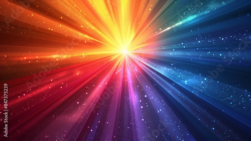 Abstract background with vibrant rainbow light rays radiating from a central point.