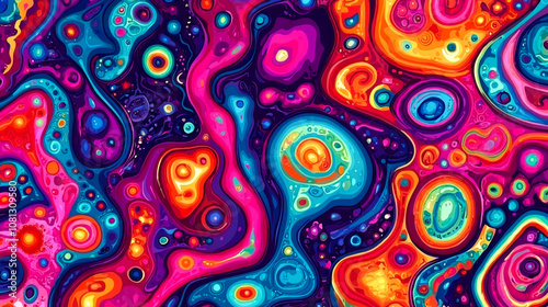 Abstract background with vibrant, swirling colors and shapes.