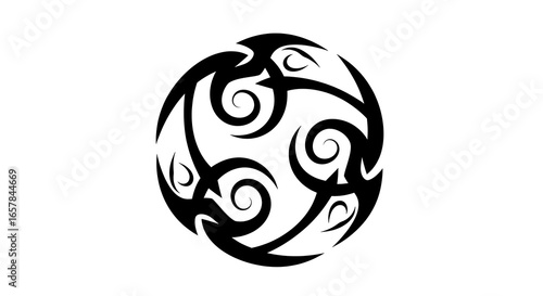 Abstract black and white tribal pattern forming a circle with swirling shapes