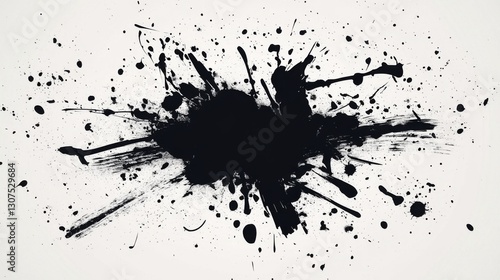 Abstract black ink splash on white background with dynamic splatter patterns