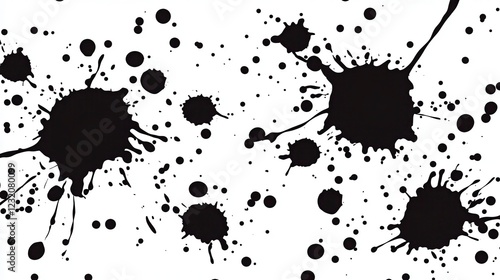 Abstract black ink splatters on a white background. High contrast monochrome pattern with various sized spots and splashes. Graphic design element