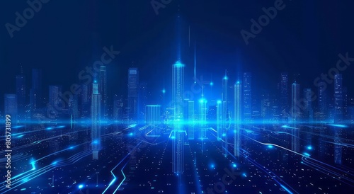 Abstract blue digital cityscape background with glowing lights and holographic elements on dark blue gradient