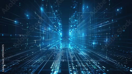 Abstract blue digital grid with glowing lines and data.