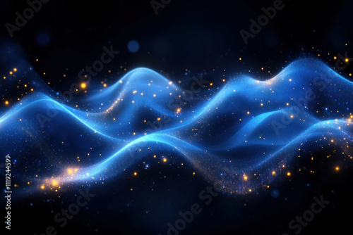 Abstract blue glowing waves with sparkling particles on a dark background.