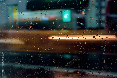 Abstract blurred colorful background. View through glass window with rain drops on bokeh city lights, night street scene