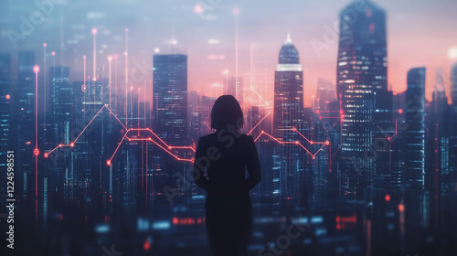 Abstract business woman stands on Smart digital Innovation city with connection network reciprocity over the twilight cityscape. of future wireless digital city and social media networking systems