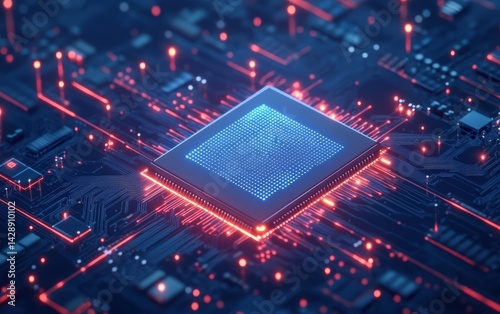 abstract circuit board background with glowing blue chip and neon text for technology design