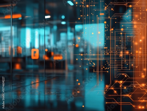 Abstract circuit board overlay on a modern office design with large glass windows and views of a city skyline