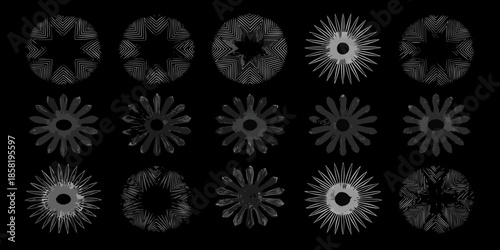 Abstract circular designs with radiating lines in grayscale artistic arrangement