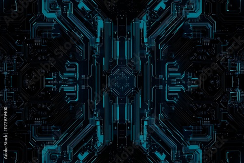 Abstract close-up of a glowing blue digital circuit board, showcasing intricate connections and technological design on a black background.