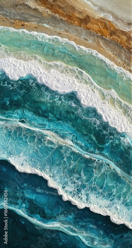 Abstract coastal scene, layered waves in teal, beige, and gold