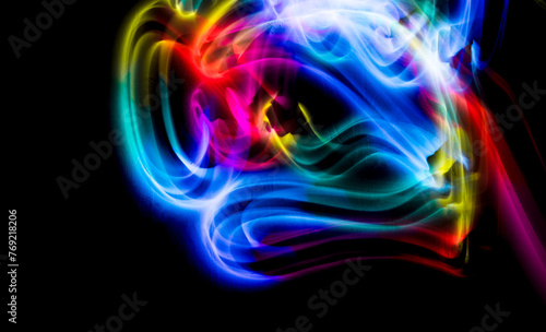 Abstract colorful irregular lines on black background and wall texture. Long exposure. Light painting photography.