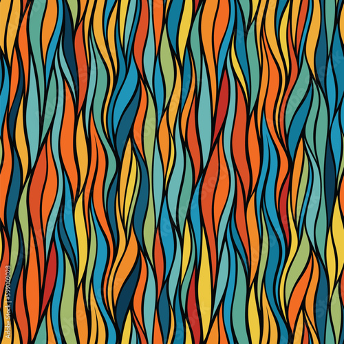 Abstract colorful seamless pattern with multicolored waves in red, blue, yellow, and green on a black background. Vector illustration.
