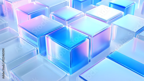 Abstract composition of iridescent blue glass cubes on white background.