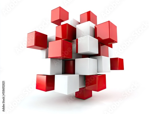 Abstract composition of red and white cubes.