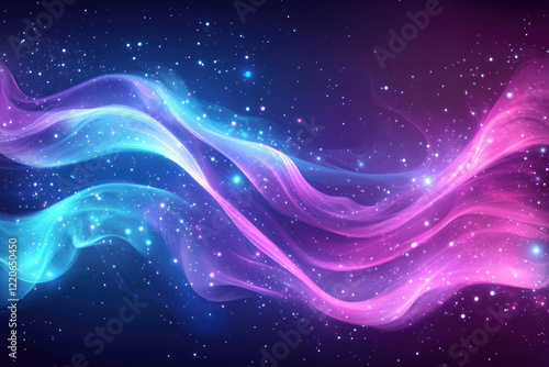 Abstract cosmic artwork depicting flowing nebulae with vibrant pink and blue hues against a starry backdrop.