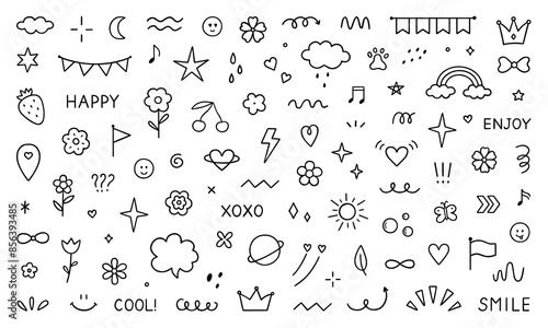 Abstract Cute kids doodle elements. Hand drawn decorative illustrations in sketch style. Arrows, stars, flowers, hearts, decoration symbols and signs. Vector illustration isolated on white background.