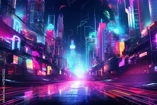 Abstract cyberpunk backdrop with neon accents and holographic elements
