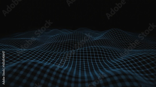 Abstract dark background with blue wireframe grid surface landscape