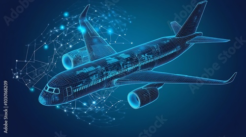 Abstract depiction of a digital blue aircraft data concept, displaying complex network connections and data streams, symbolizing innovation and efficiency in air transportation systems.