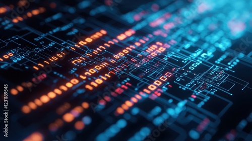 Abstract digital background with colorful circuitry and binary code.