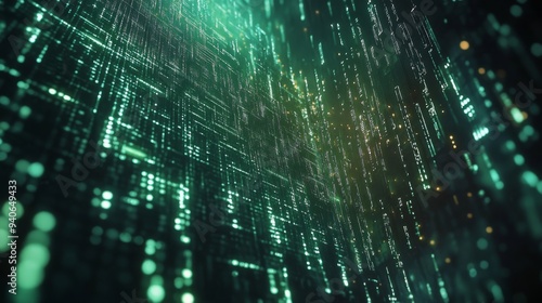 Abstract digital background with green and gold glowing particles flowing downwards.