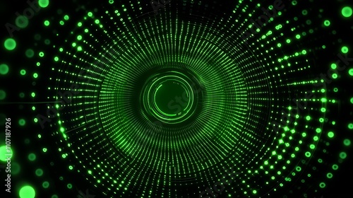 Abstract digital background with green glowing dots and lines forming circular patterns in a tunnel effect