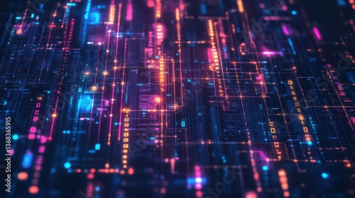 Abstract Digital Circuit Board Neon Lines, Glowing Nodes, Data Stream Background