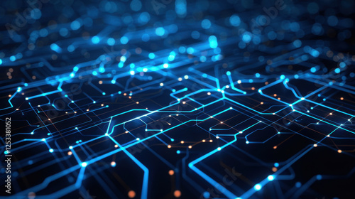 Abstract digital circuit board with glowing blue lines and nodes, representing technology and connectivity in futuristic design