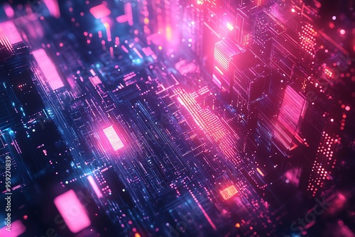Abstract Digital Circuit Board with Pink and Blue Lights.