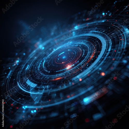 Abstract digital circular interface with concentric rings and glowing elements