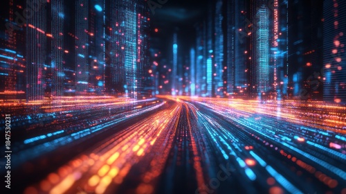 Abstract digital city with glowing neon lights and a blurred road in the foreground.