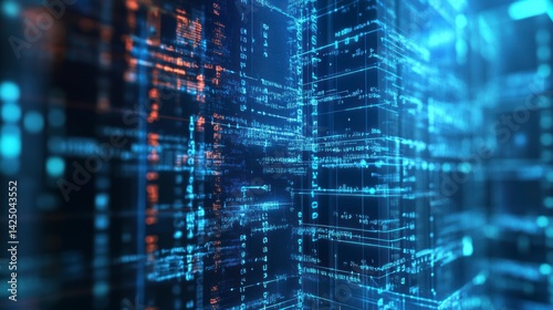 Abstract digital data stream, glowing blue and orange code forming a futuristic city.