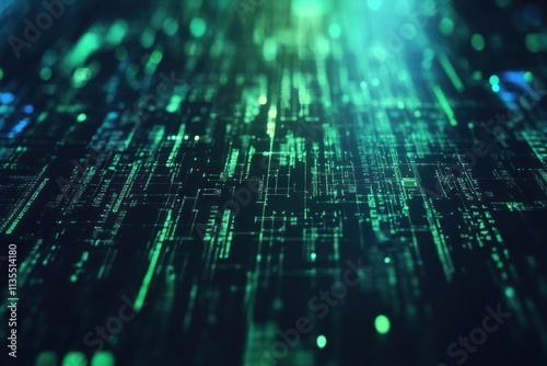 Abstract digital data stream, glowing green lines and particles on dark background.